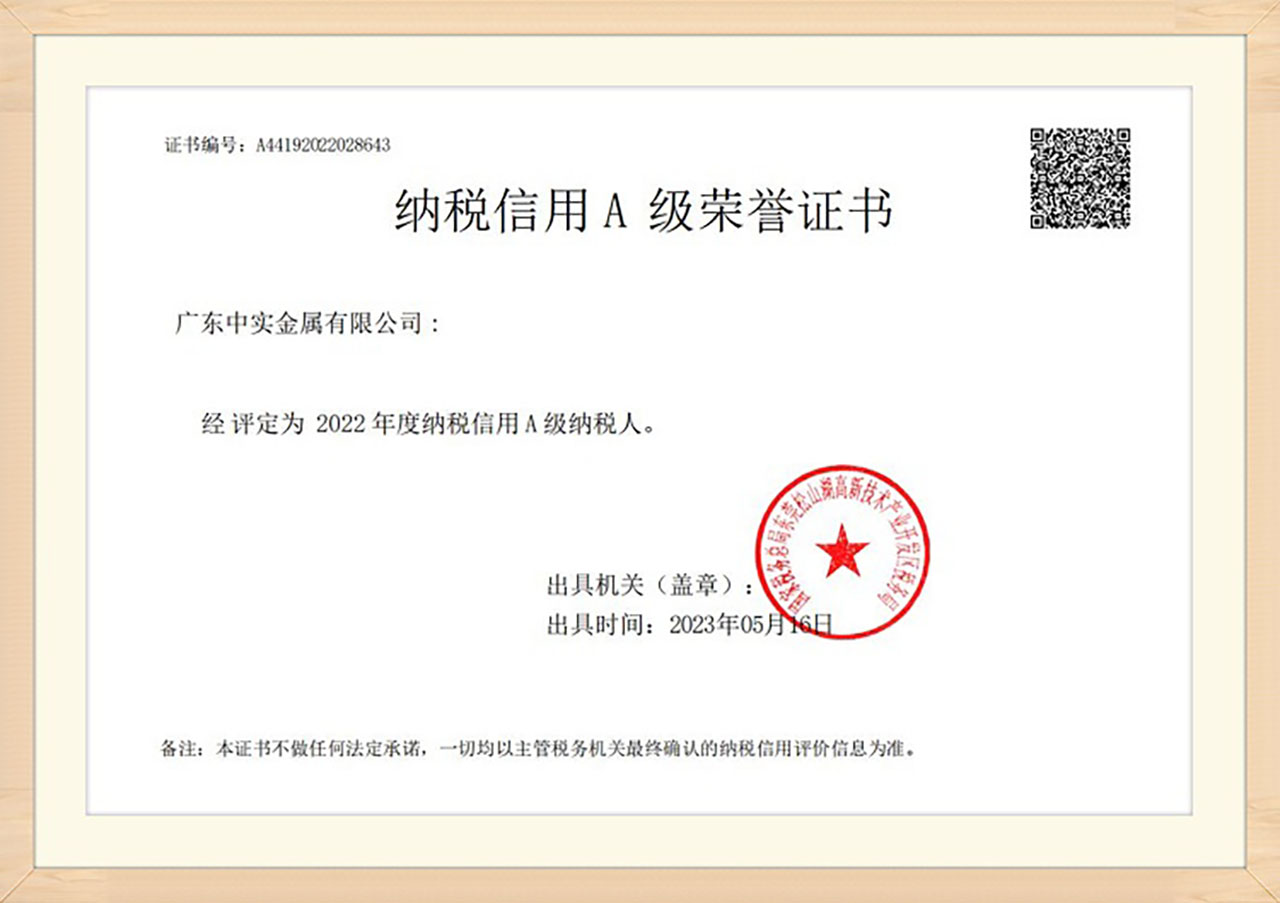 近日,國(guó)家税務(wù)总局广东省税務(wù)局公(gōng)布了2022年度纳税信用(yòng)评定结果,广东中(zhōng)实金属有(yǒu)限公(gōng)司荣获“ 2022 年度纳税信用(yòng) A 级纳税人”。