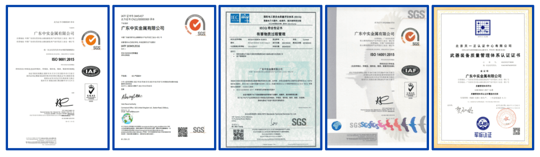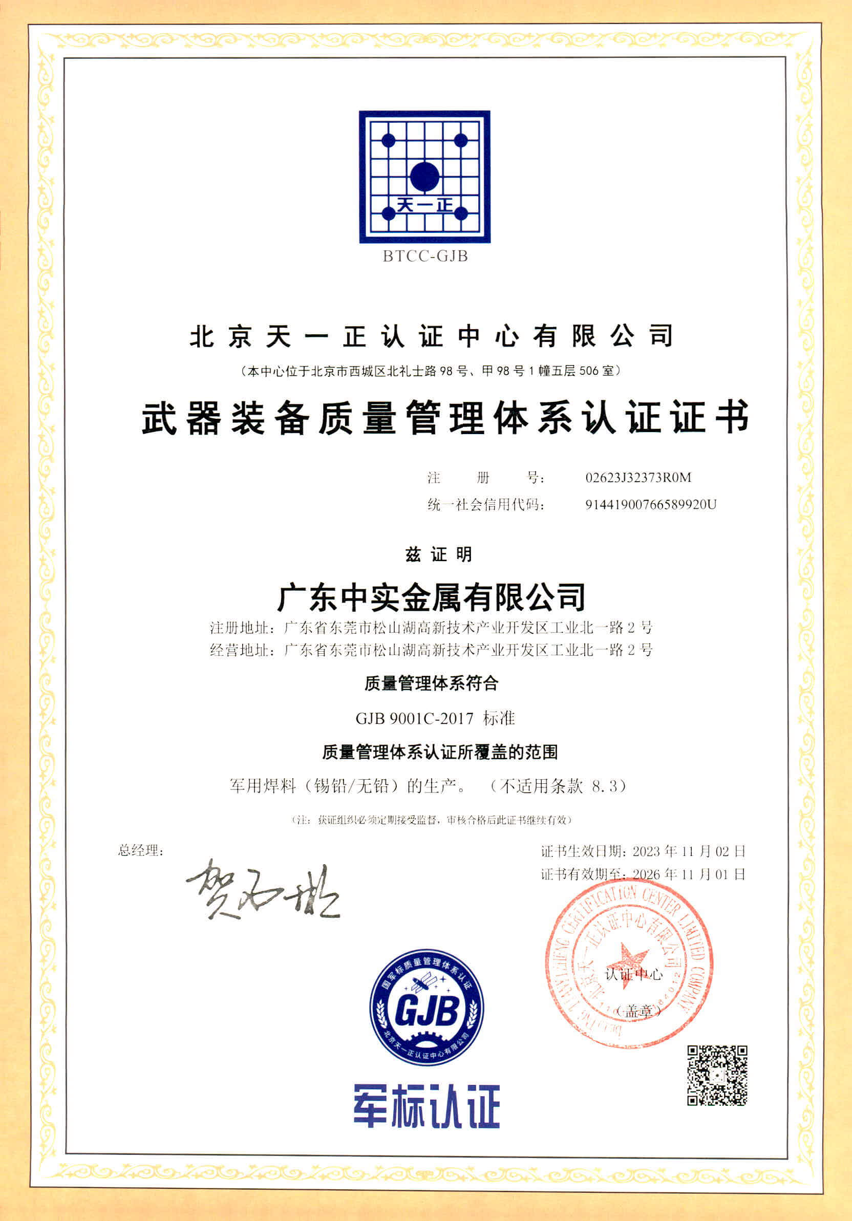 11月2日,广东中(zhōng)实金属有(yǒu)限公(gōng)司顺利通过GJB9001C-2017军工(gōng)产(chǎn)品质(zhì)量管理(lǐ)體(tǐ)系认证,获得北京天一正认证中(zhōng)心有(yǒu)限公(gōng)司颁发的《武器装(zhuāng)备质(zhì)量管理(lǐ)體(tǐ)系认证证书》。